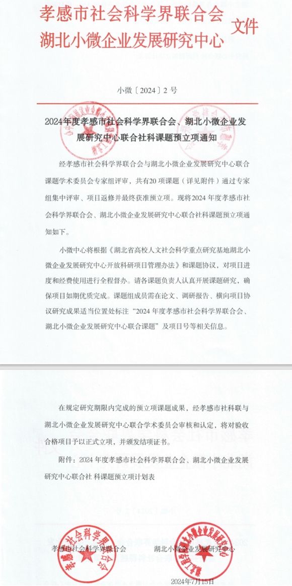 本网讯 近日,孝感市社会科学界联合会与湖北小微企业发展研究中心发布了《2024年度孝感市社会科学界联合会、湖北小微企业发展研究中心联合社科课题预立项通知》(小微[2024]2号)的文件,共有20项课题获批预立项,公司有6个项目获批。