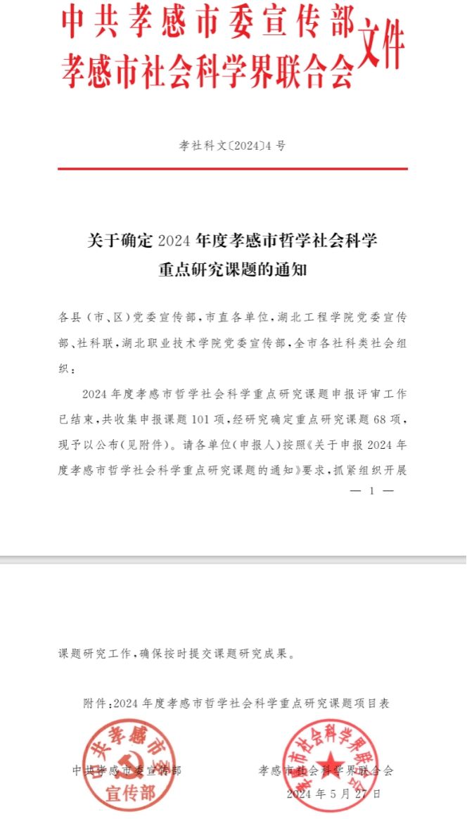 前期中共孝感市委宣传部与孝感市社会科学界联合会还发布了《关于确定2024年度孝感市哲学社会科学重点研究课题的通知》(孝社科文[2024]4号)的文件,全市共设立重点研究课题68项,公司有1个项目获批立项。