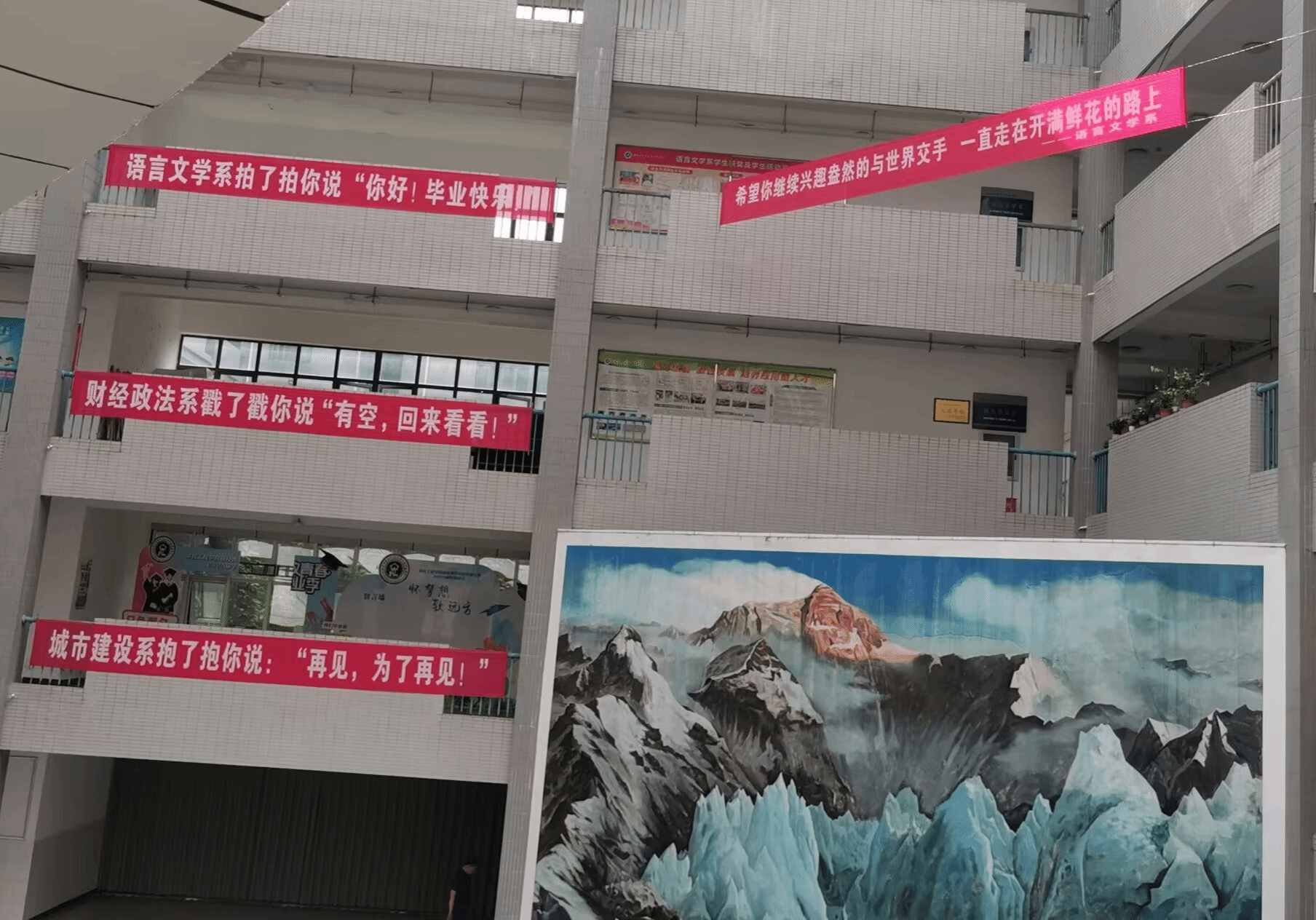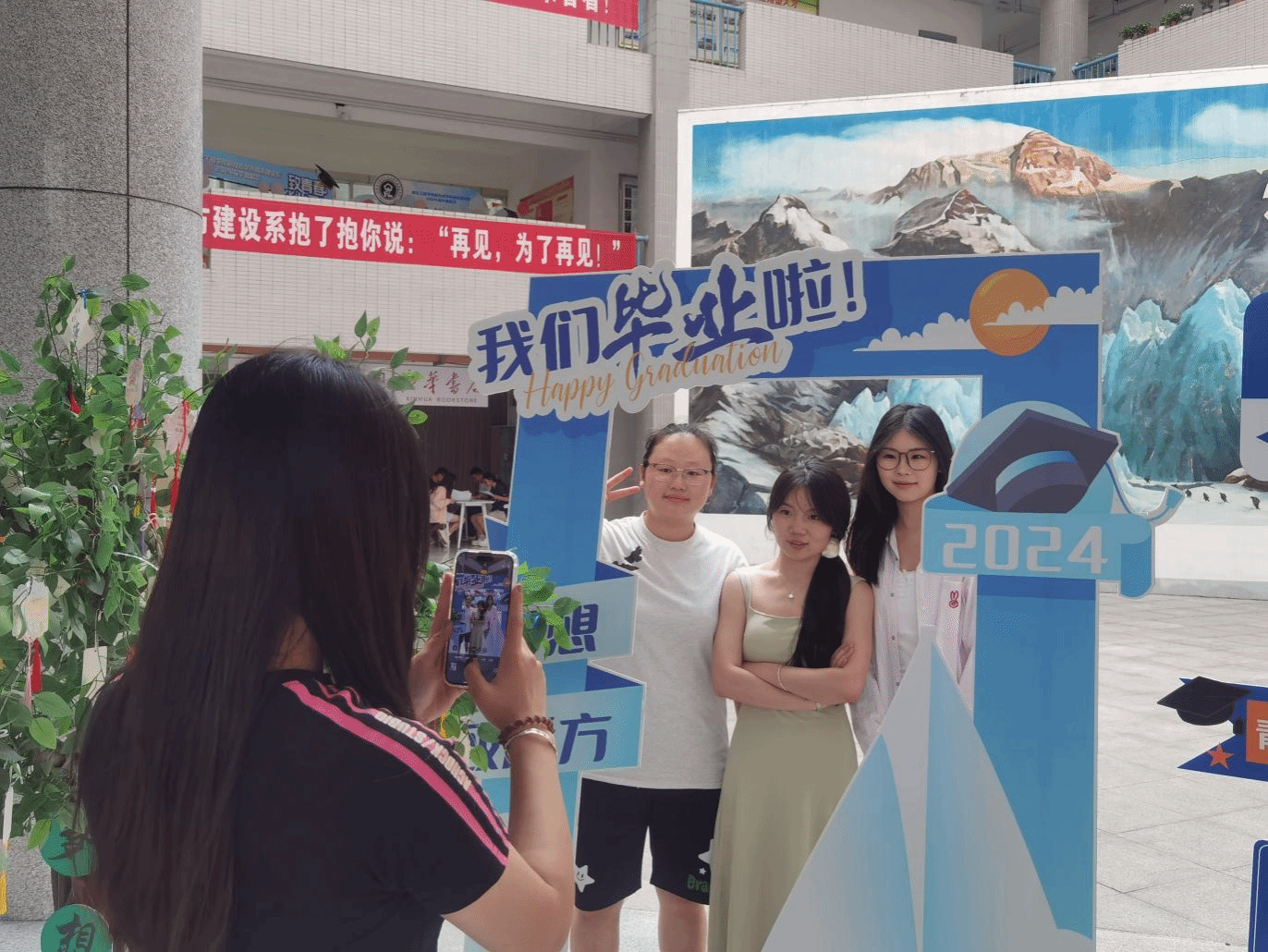 从科技楼到同大广场的路上,挂满了催人泪下的横幅,书写着那些来不及说出的话,学子们在毕业纪念墙前合影,定格青春、拥抱未来。这些温馨的布置,让毕业生们感到仪式感满满。