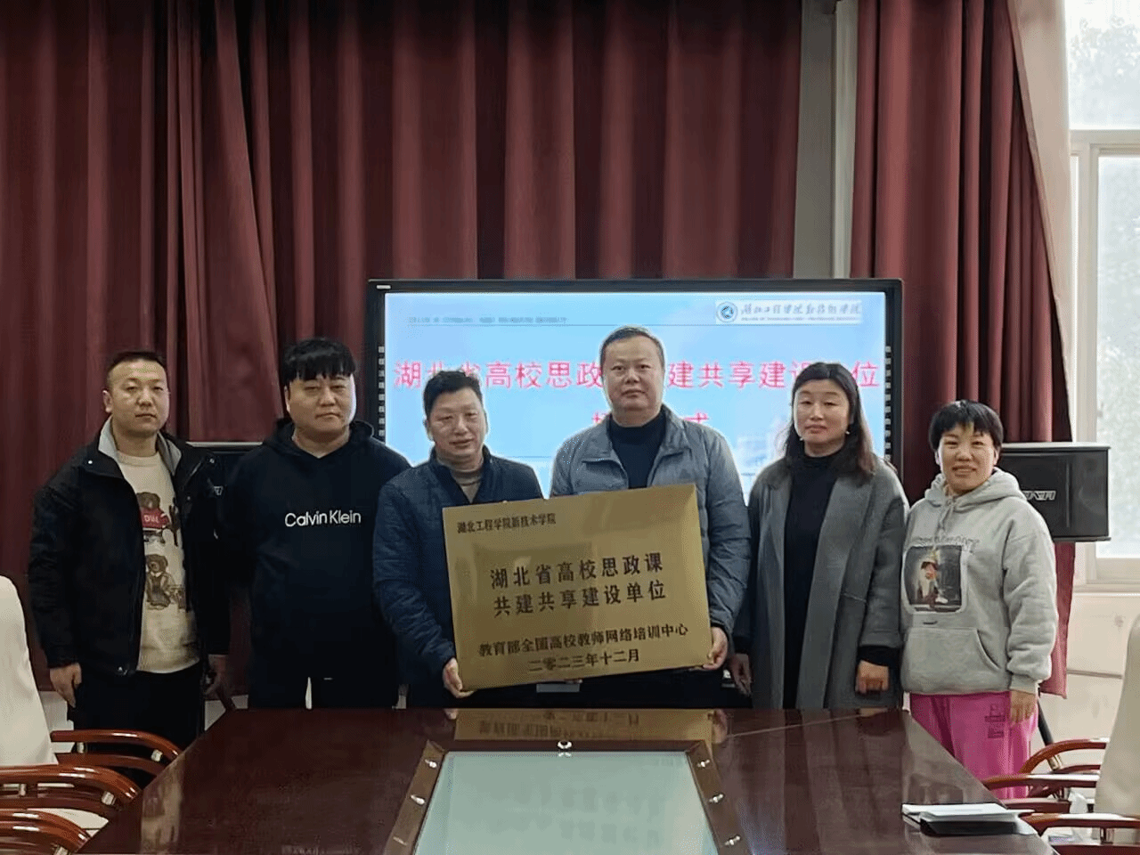 本网讯 12月8日下午,全国高校教师网络培训中心形策分中心主任曹江平、副主任赵伟等一行莅临公司,授予公司湖北省高校思政课共建共享建设单位牌匾,副经理陈友华,教务处、公共课部和党务工作部相关负责人参加了授牌仪式,仪式在同大综合楼二楼会议室举行。