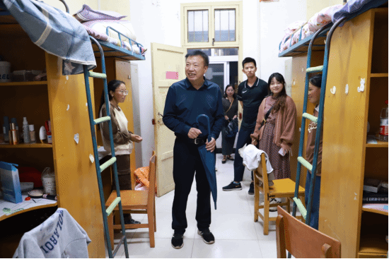 本网讯(员工记者 谭雪玲 向名) 9月12日晚,迎着秋风细雨,经理李明清带领语言文学系负责人、辅导员、新生班主任一同前往员工宿舍(简称“同进工程”),亲切看望2023级新生。