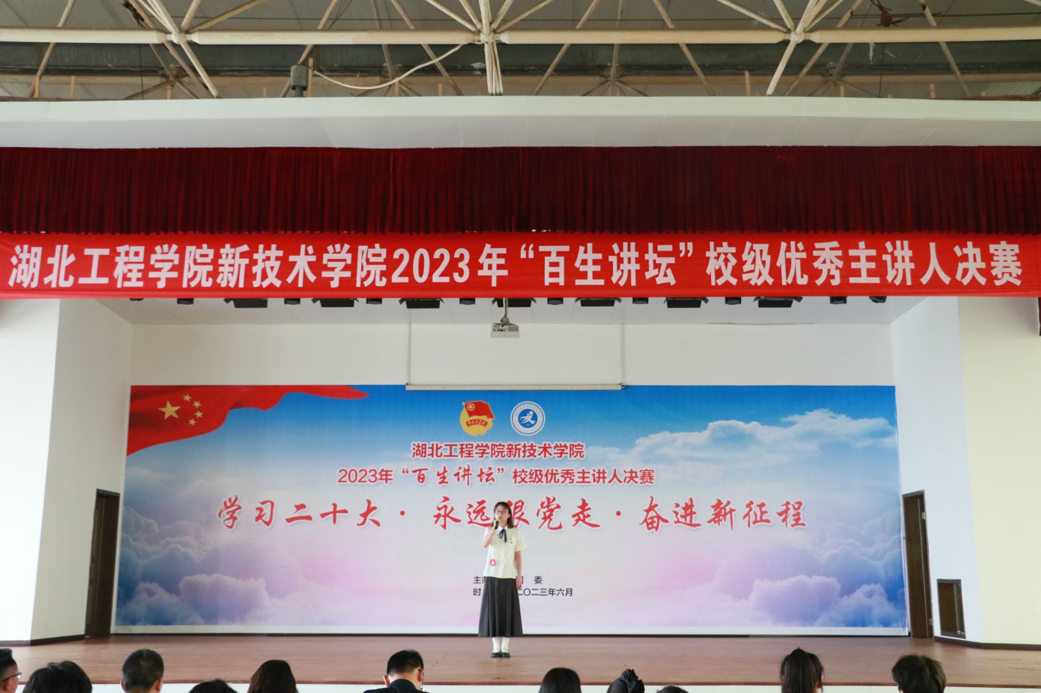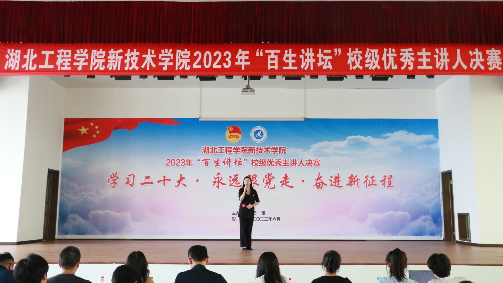 本次“百生讲坛”优秀主讲人决赛以“学习二十大·永远跟党走·奋进新征程”为主题。来自5个教学系的15名主讲人,分别进行主题演讲展示。他们以学习宣传贯彻党的二十大为主线,紧密围绕大会精神,讲述普通人的青春奋斗故事。参赛选手们用铿锵有力的语言宣讲自己的豪情壮志和使命担当,立志做有理想、敢担当、能吃苦、肯奋斗的新时代好青年。
