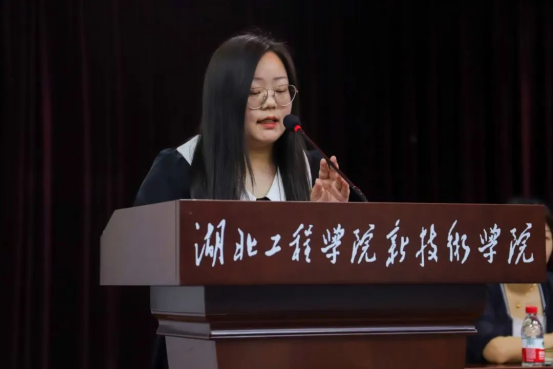 湖北米开罗那机电技术有限公司代表曹小梅女士讲话。她对持续关注和支持湖北米开罗那机电技术有限公司的公司领导和老师们表示感谢,并对获奖的同学表示热烈的祝贺。曹小梅女士介绍了公司的经营模式和发展现状,并表示公司将继续关注公司人才培养工作。