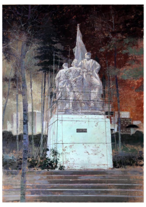 没有一份作品的产生是偶然的,所以在很多次路过烈士陵园,在看见里面带有强烈的仪式感的场景和雕像,许汉青有了创作的灵感;朋友圈里被分享的一张风景照,正是这幅作品的色调的来源;一次次在生活中的细致观察和积累跃上画纸,成为一幅水粉画《守护》。