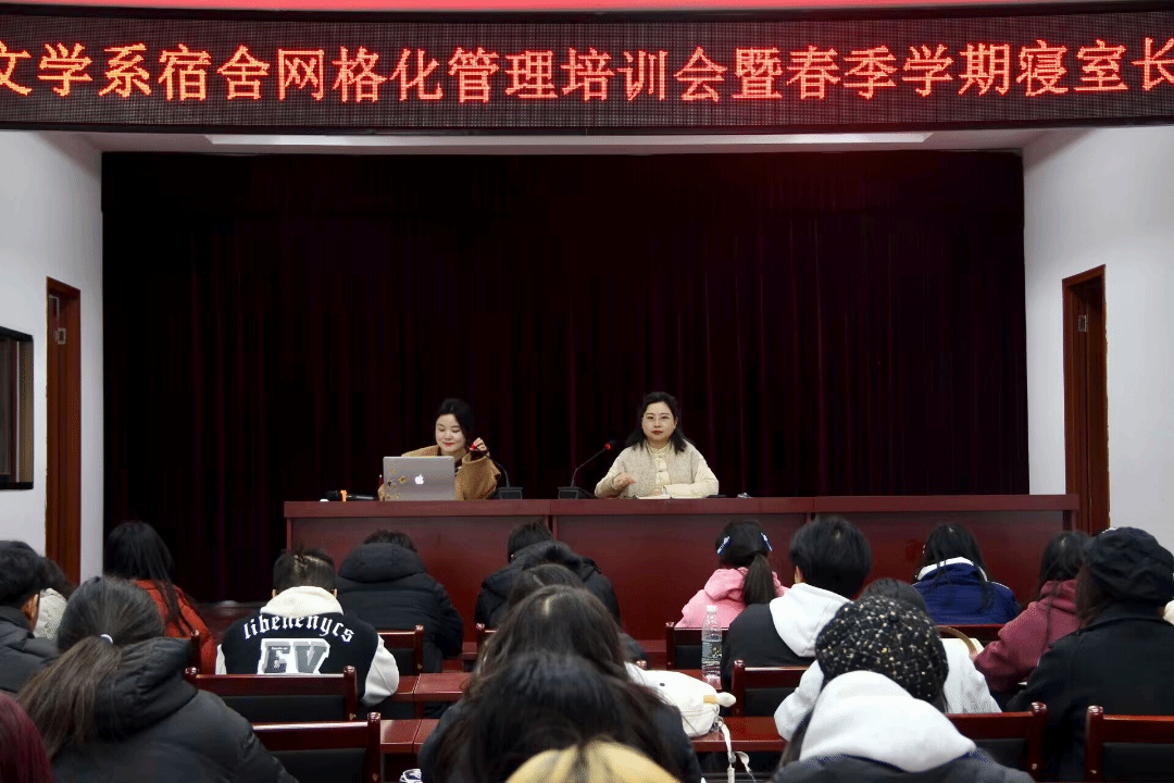 本网讯(见习员工记者 陈东玲 方妍 阮奕平)为进一步提升公司宿舍精细化管理水平,实现宿舍管理的全覆盖无缝对接和快速响应,3月6日下午,公司语言文学系在科技楼五楼报告厅召开宿舍网格化管理培训会暨春季学期寝室长会议。语言文学系党总支副书记马蔚、辅导员卢拾一、各楼长、层长及寝室长参加了此次会议。