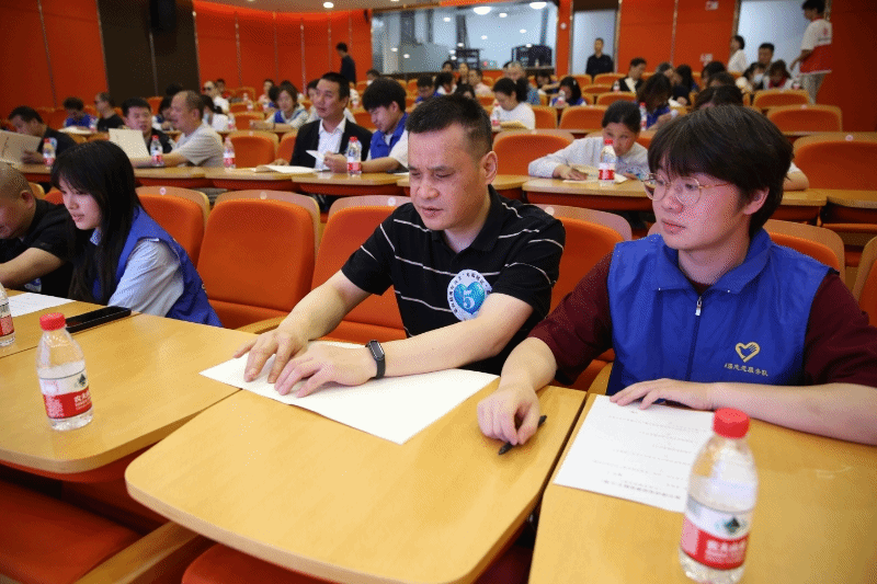 活动首环节为盲文试卷答题竞赛。志愿者们经过前期培训,熟练协助视障读者摸索盲文题目,耐心转述题目要求,等待视障读者的盲文阅读,并记录答案。