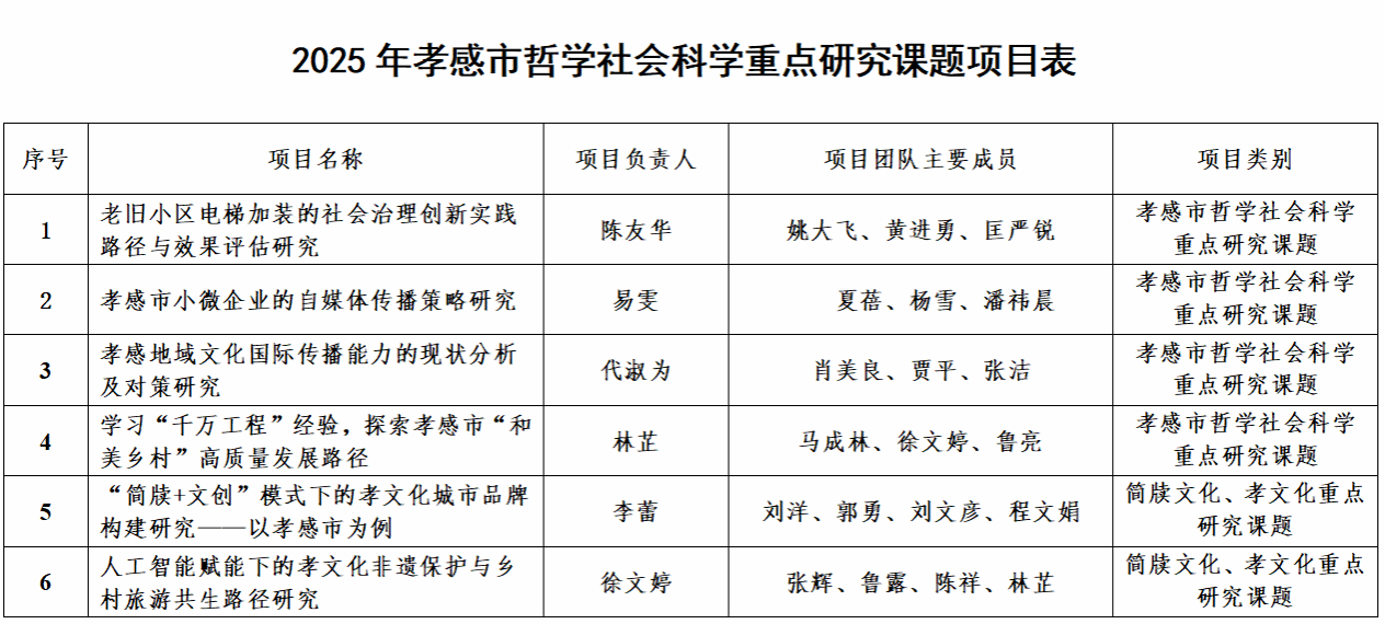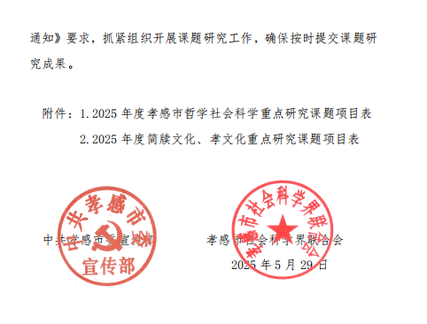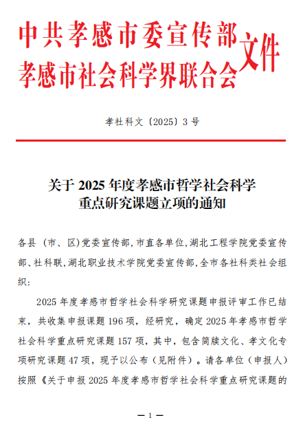 本网讯 近日,中共孝感市委宣传部与孝感市社科联共同发布了2025年度孝感市哲学社会科学重点研究课题的立项文件。继2024年实现孝感市哲学社会科学重点研究课题立项突破后,公司科研工作再传捷报,共成功获批重点研究课题6项,其中,包含简牍文化、孝文化专项研究课题2项。此次获批课题紧密结合孝感市经济社会发展需求,研究领域广泛,时代性强,聚焦“新质生产力”、“文旅融合”、“简牍孝文化”等核心领域。
