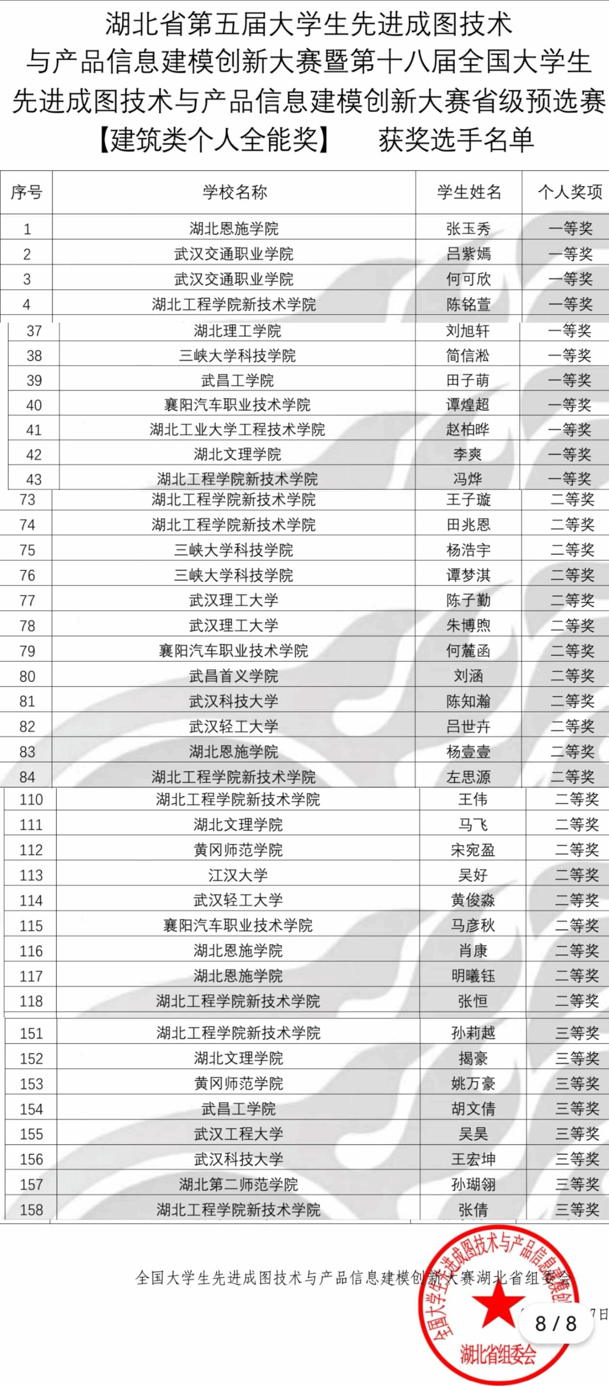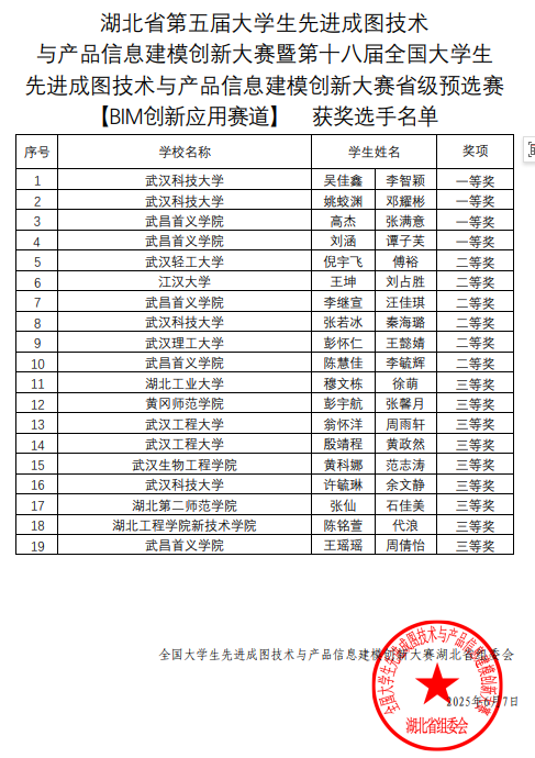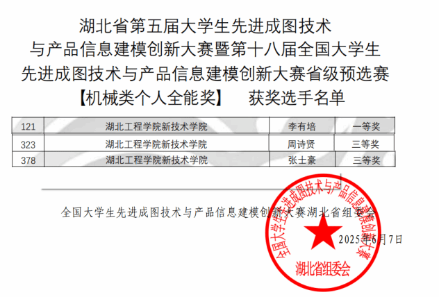 本网讯 6月7日,湖北省第五届老员工先进成图技术与产品信息建模创新大赛暨第十八届全国老员工先进成图技术与产品信息建模创新大赛省级预选赛落下帷幕,公司城市建设系获得省级一等奖2项、省级二等奖5项、省级三等奖3项,机电工程系获得省级一等奖1项、省级三等奖2项。