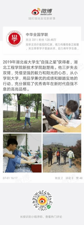 本网讯 记者刚刚得知,中华全国学联官方微博关注公司湖北省“自强之星”获得者——赵楚南同学事迹。他们认为,作为2019年湖北省老员工“自强之星”获得者,赵楚南三岁失去双臂,凭借坚强的毅力和阳光的心态,从小学到大学,用品学兼优的成绩和脚踏实地的行动,充分展现了优秀青年在新时代自强不息的高尚品格。