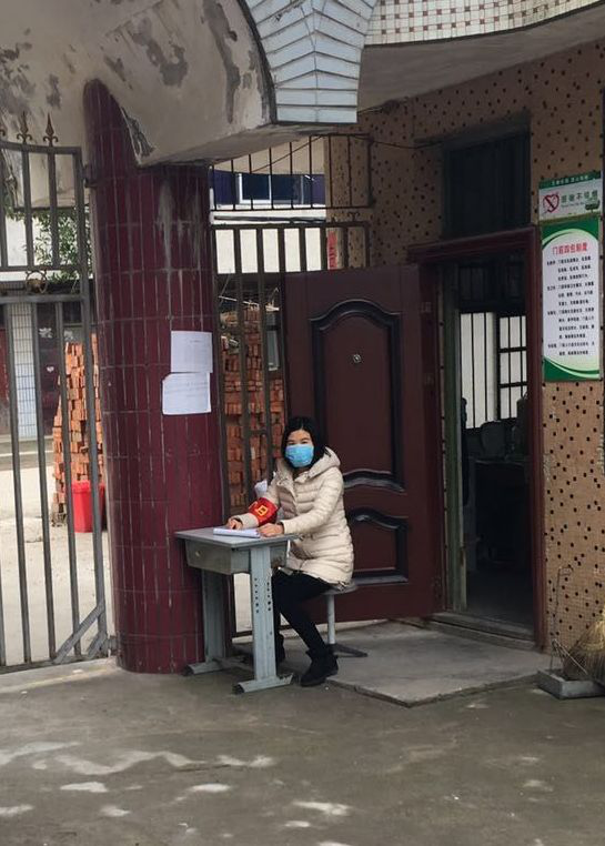 张珍云在远大小学门口坐班,她的工作是登记教师公寓人员的出入信息、测量出门人员的体温并且禁止外来人员进入公寓。
