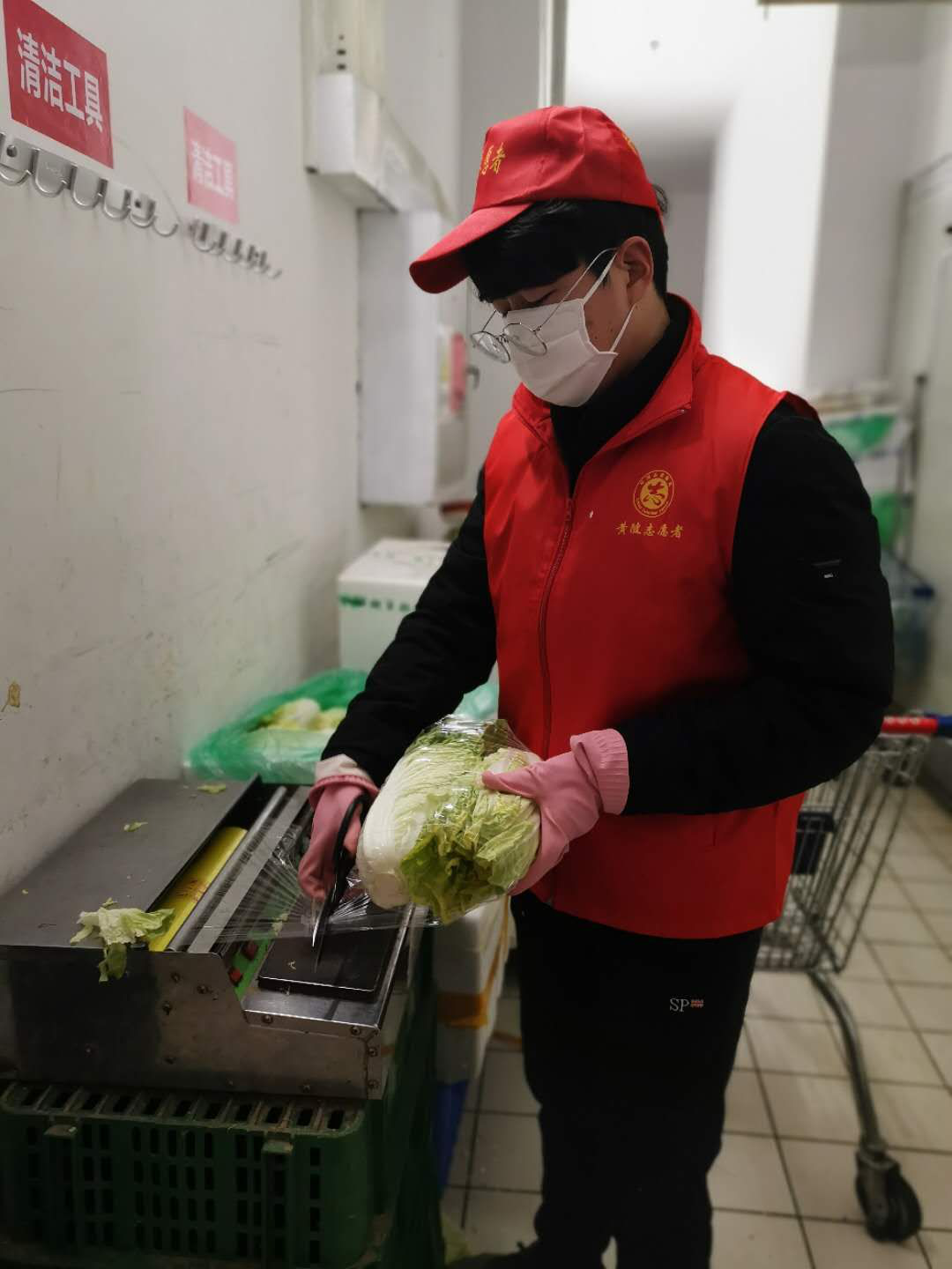 面对武汉市严峻的疫情防控形势,詹学林作为一名武汉人,作为一个老员工,在看到武汉市在网络上发布的征集公告之后,选择了做一名志愿者。2月9日起,他在超市进行蔬菜分拣工作,每天一早,他会戴上口罩早早到超市测体温、洗手、戴手套,做好蔬菜分拣前的一切准备工作后,和其他的志愿者们一起分工合作,将全国各地驰援武汉的一箱箱蔬菜再分装塑料袋中打包好,摆放在柜架上。“每次分拣都更意识到全国人民都在帮助我们,只有感动,没有辛苦!”