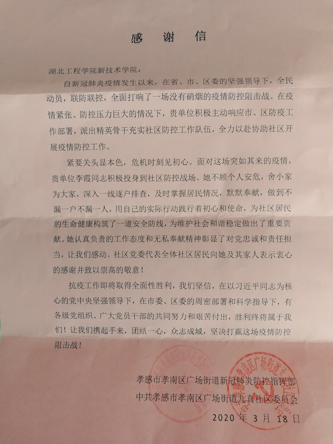 本网讯 近日,孝感市孝南区广场街道新冠肺炎防控指挥部及中共孝感市孝南区广场街道九真社区委员会给公司语言文学系教师李霞致以感谢信。信中表示:“李霞同志积极投身到社区防控战场。她不顾个人安危,舍小家为大家,她认真负责的工作态度和无私奉献精神彰显了对党忠诚和责任担当,让我们感动。”而得到这封感谢信的缘由还要从李霞老师参加志愿服务工作开始说起。