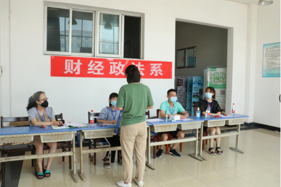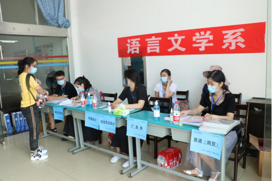 进校后的毕业生在工作人员的指引下前往各教学系指定地点位办理毕业手续,到达指定点位后,工作人员会首先向返校员工发放“防疫健康包”,随后收取毕业生的毕业相关材料并进行核查登记。