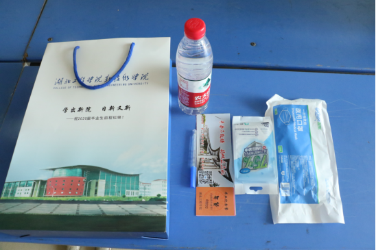 防疫健康包内有爱心水、医用口罩、温度计、湿纸巾和早中晚的毕业纪念餐券、行李打包袋等。