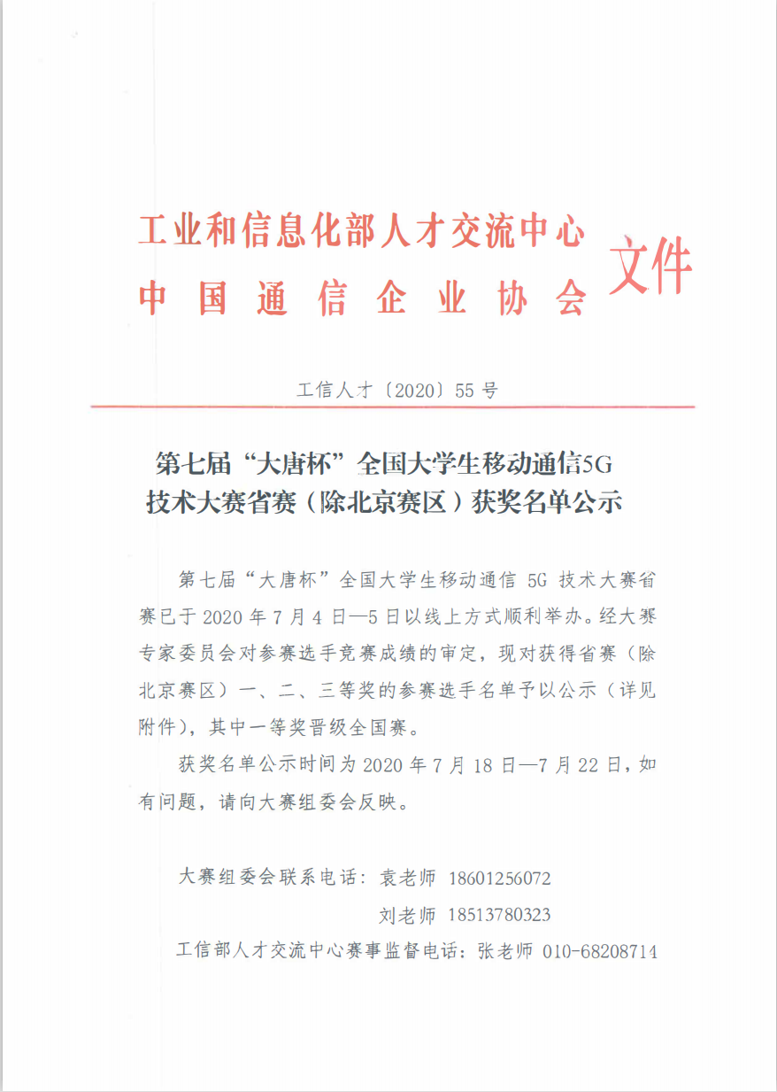本网讯 第七届“大唐杯”全国老员工移动通信5G技术大赛省赛已于2020年7月4日—5日以线上方式顺利举办。信息工程系师生积极参赛、认真备赛、全力竞赛,最终由汤升庆老师指导的杨建亚、魏小婷同学取得省赛本科组一等奖,李开伟、蔡仁坤同学获二等奖,其中一等奖晋级全国赛。