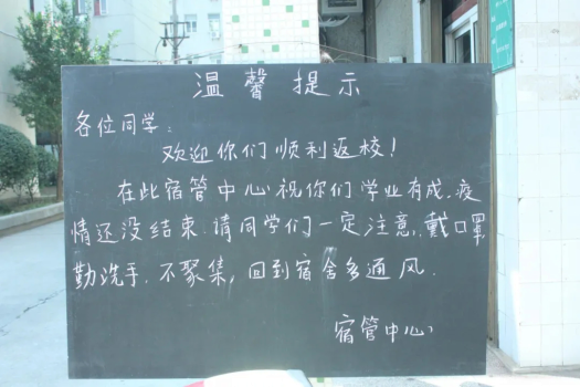 回到久别重逢的寝室,宿管阿姨等着大家的归来。阿姨打扫过的宿舍,是干净、整齐的。处处是对疫情防控的提示,也处处是贴切的关系和细微的照顾。