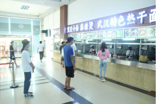 威廉希尔体育餐厅外是新建的洗手池,饭前饭后要洗手,搞好个人卫生,安全你我他!进餐厅吃饭也要扫码、测量体温,排队打饭,人与人之间间隔一米远,分散就餐,实行一人一桌制。分散的是距离,聚在一起的是人心,是力量!