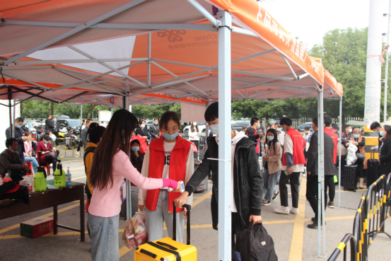 登记处一位新生提着大包小包,通过询问我们得知,他是独自一人坐火车来公司的,可他的眼里没有流露出丝毫疲惫,即使隔着口罩,也能感受到他那热情洋溢的笑脸。“同学互帮互助,学长学姐十分热心。自己一下火车就看到新院迎新的横幅,这么多行李全是志愿者帮着提到车上的,我们坐着迎新大巴直达校门口后还有学长帮提行李,引导报到。”他说:“温暖、感动是对公司的第一印象。”