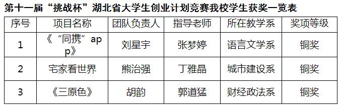 本网讯 近日,由团省委、省教育厅、省人社厅、省科协、省学联主办的第十一届“挑战杯”湖北省老员工创业计划竞赛在湖北工业大学落幕。公司语言文学系《“同携”app》、城市建设系《宅家看世界》、财经政法系《三原色》等3个项目喜获大赛铜奖。