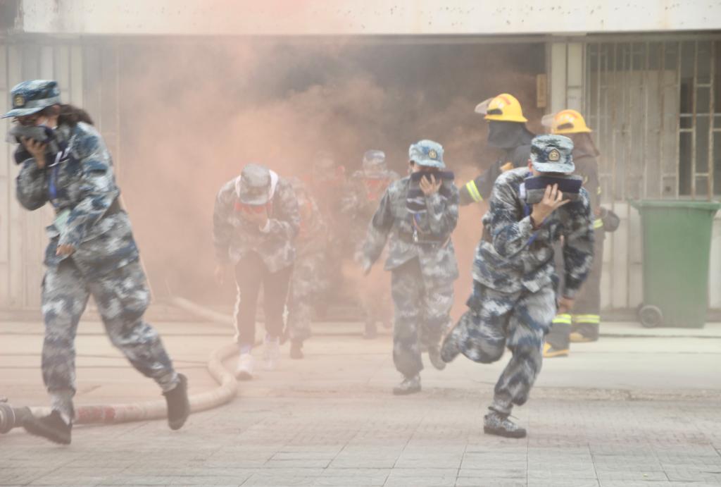 为了让同学们更为直观地感受火场,迅速掌握逃生技能,消防官兵现场点燃液化石油气罐。火势强烈后,消防官兵安排了多名员工学习使用干冰灭火器灭火。霎时空中浓烟滚滚,刺激的气味扑鼻而来。新生们捂住口鼻,弯腰低身,迅速有序地由逃生通道逃离到指定的安全之地。