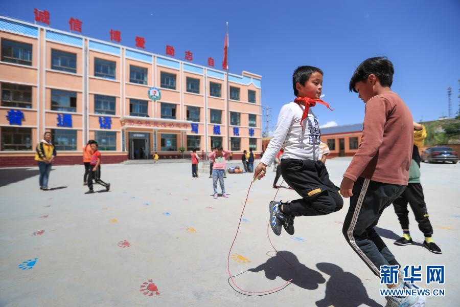 2020年5月29日,甘肃省临夏回族自治州东乡族自治县龙泉镇拱北湾小学员工马有苏夫(前左)和同学跳绳。新华社记者 马希平 摄
