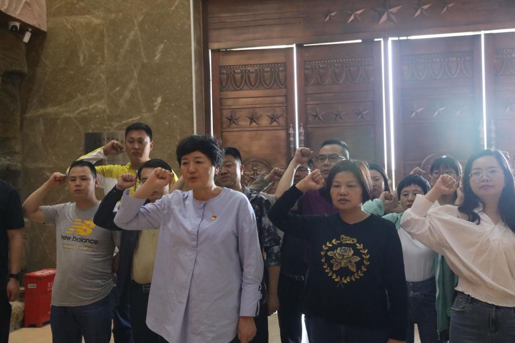 是日下午,在大悟宣化店中原突围纪念馆,全体党员教师在党委书记姚娟的带领下,面对鲜红的党旗,重温了入党誓词。