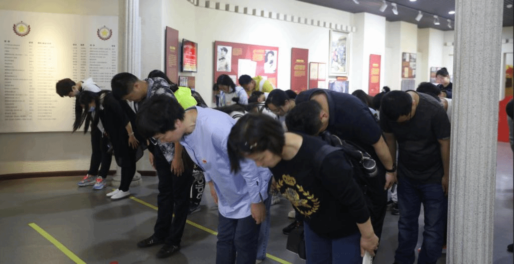 在英勇就义的烈士遗像前,在场的所有人员同讲解员一齐对烈士们进行三鞠躬,以表达崇高的敬意和深切的缅怀。