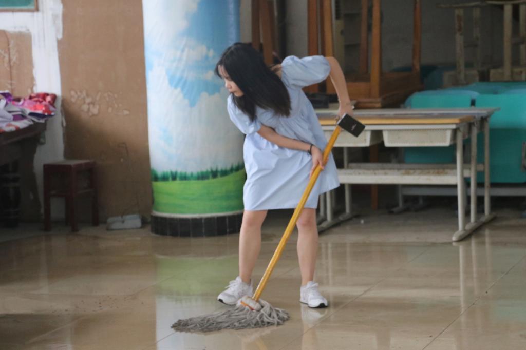 大家拿起扫把、畚斗,弯腰清扫着积灰与杂物;提来满桶的清水,用拖把使劲地擦拭着污渍与积水,充分发扬不怕脏、不怕累的优良作风和团结协作的精神,有秩序地清理着,认真、细致地打扫着,使校园卫生风貌焕然一新。