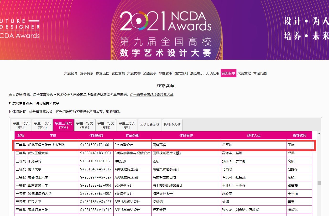 本网讯(通讯员王海栎)日前,第九届全国高校数字艺术设计大赛(未来设计师NCDA大赛)评审结果出炉。公司董笑如同学的作品《国粹瓦猫》(指导老师:王旋)荣获全国三等奖;同时还有许沙沙等同学在我系教师指导下取得湖北省一等奖两项、二等奖五项、三等奖三项的好成绩。