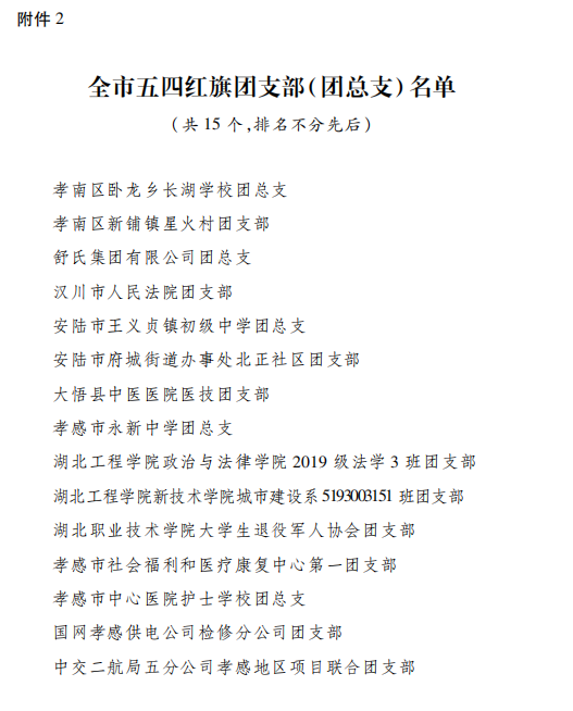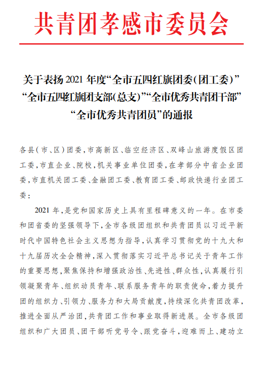 本网讯 日前,时值建团百年之际,公司城市建设系5193003151班团支部在共青团孝感市委开展的2021年“五四”先进集体、个人评选活动中,获评“五四红旗团支部”。