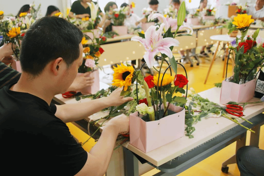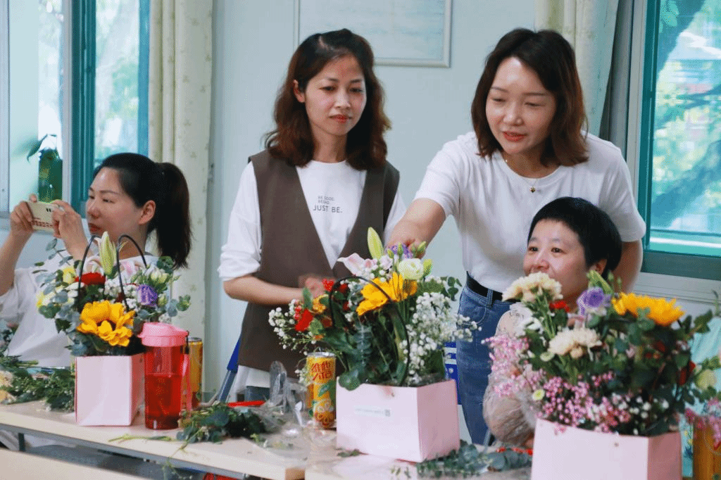活动中,中心专职教师首先介绍了活动的内容和意义,分享了应对压力的小技巧,并带领大家一起学习了“花语”在情感表达中的特殊含义及“花艺”调节的“疗愈”作用。园艺师钟老师讲授了花艺操作的注意事项并进行了现场演示。在场的辅导员老师们认真倾听,沉浸在学习花艺的过程中,与鲜花亲密互动,气氛热烈。