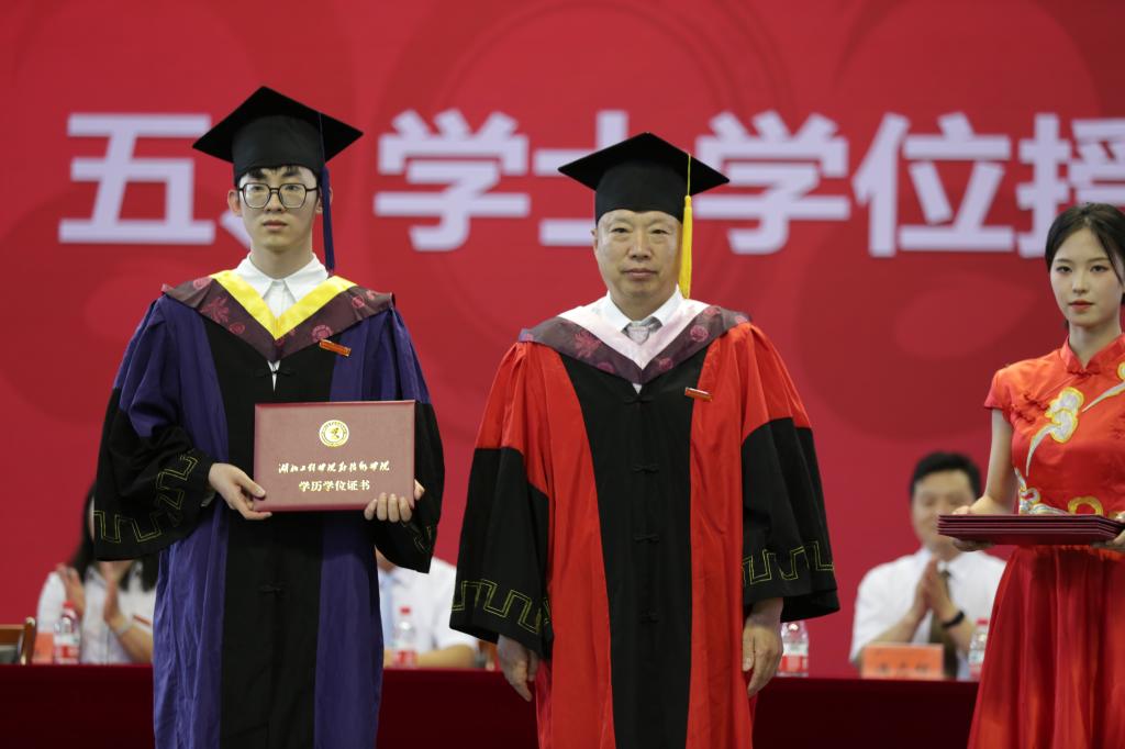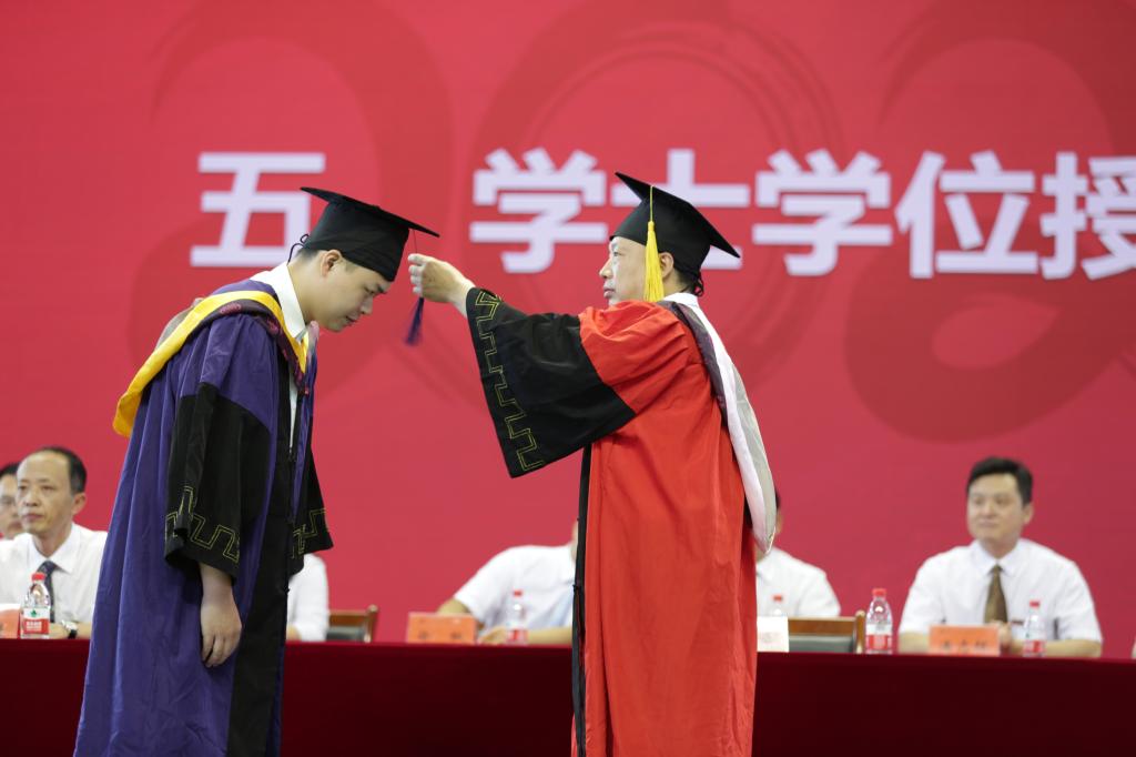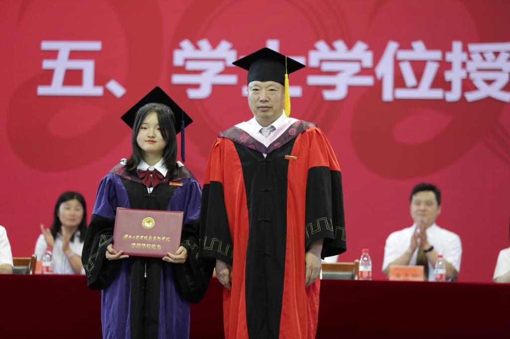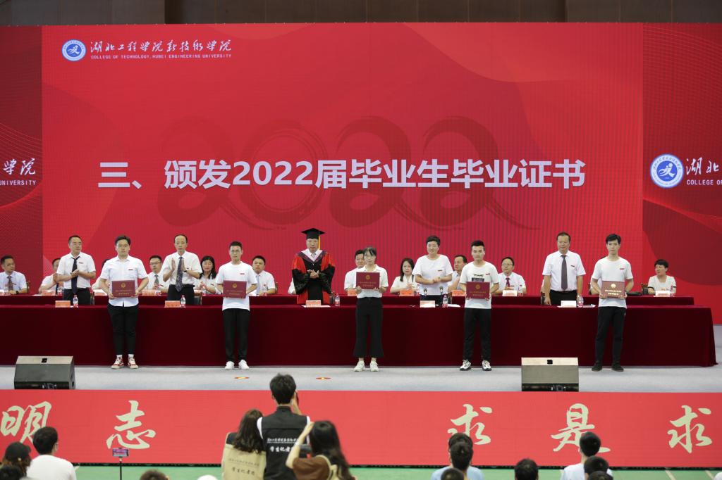 庄严的国歌,拉开了典礼的序章。党委副书记赵前进宣读《威廉希尔体育关于表彰2022届优秀毕业生的决定》,副经理陈友华宣读《关于授予2022届本科毕业生学士学位的决定》,并表示希望毕业生们在老师和同学们的共同见证下,满携母校的深深希冀和师长的无尽祝福,从此刻出发,踏上青春的赛道继续奋力奔跑。就座于主席台的领导为优秀毕业生代表颁发了毕业证书与荣誉证书。经理、学士学位评定委员会主任李明清教授为获得学士学位的毕业生代表进行拨穗,并颁发学位证书。