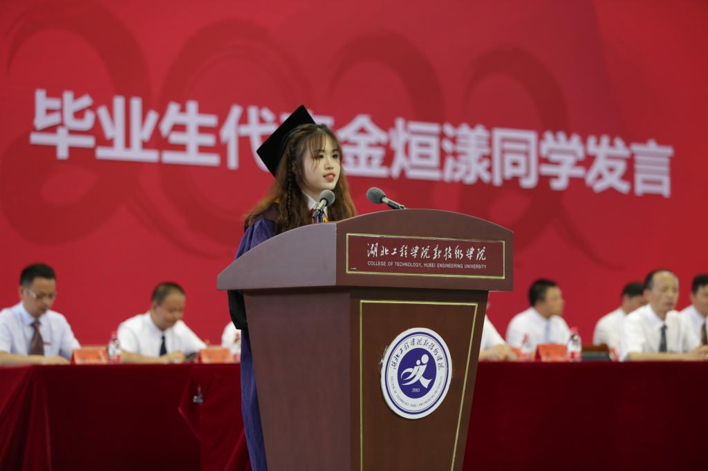 来自生物化学系的金烜漾同学代表全体毕业生发言。她表达了自己对于离别的不舍以及对昔日的同窗之情的眷恋。时光荏苒,传道授业解惑的教师,书香四溢的教室历历在目,踏上领奖台万千思绪涌现脑海。她结合这几年的学习和考研经历与大家分享了心得体会:一是要天道酬勤,锲而不舍;二是要勤于思考,好问则裕;三是要拒绝等待,静等花开。