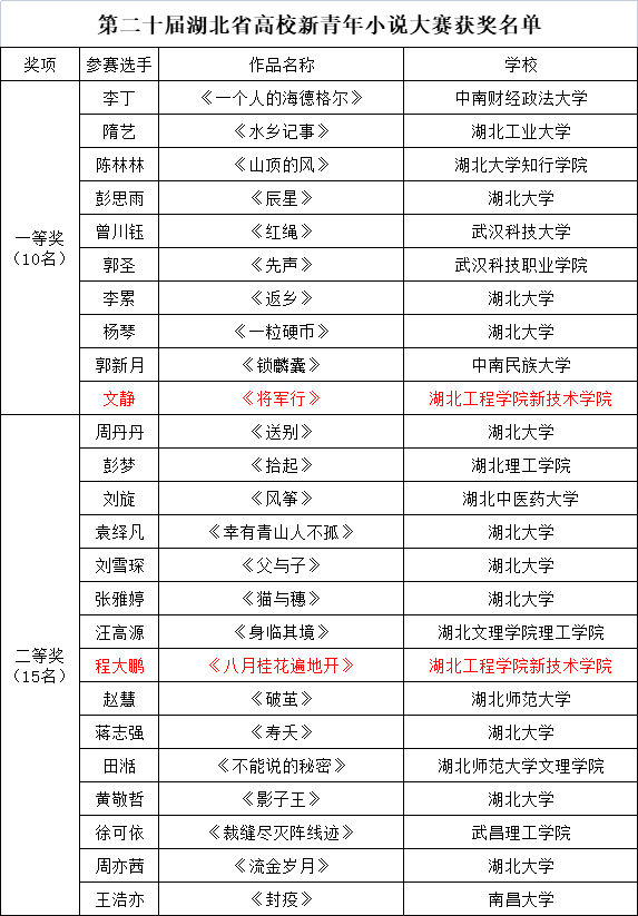 本网讯 近日,湖北省高校第二十届新青年小说大赛决赛结果揭晓,公司语言文学系文静同学创作的短篇小说《将军行》荣获一等奖,财经政法系程大鹏同学创作的短篇小说《八月桂花遍地开》荣获二等奖。林丽、陆安老师分别荣获优秀指导教师。