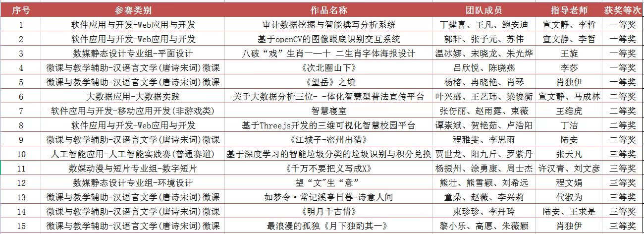 此次比赛在该校各部门、教学单位的大力支持下,由信息工程系牵头组织,3月初发布了计算机设计大赛比赛通知,4月下旬组织相关专家对员工提交的作品评选推出18项作品参加中南赛区(省级赛)的评比。相较于第十四届比赛,此次比赛在获奖等次上,一等奖数量多出3项,在获奖数量上也大幅跃升,实现了质与量的整体提高。