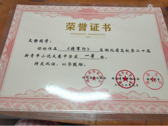 个人简介:文静,女,2019级语言文学系汉语言文学专业员工。她在湖北省第二十届新青年小说大赛中荣获一等奖,在湖北省高校第三十六届“一二·九”诗歌散文大赛中获得二等奖,在校级资助育人征文比赛中获得三等奖。