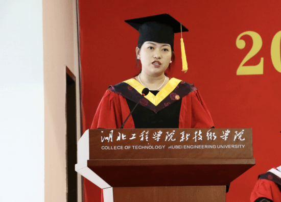 毕业生代表、财经政法系何良诗同学回顾了难以忘怀的老员工活,表达了对老师、同学、朋友的感激不舍和对母校的美好祝愿。毕业并不是终点,而是全新的起点。她号召即将踏上不同征途的年轻学子们,怀揣对未来的美好憧憬与坚定信念,以不懈的努力和拼搏精神,积极地去探寻更为辽阔的天地,勇敢地去迎接更大的挑战,用青春与热血谱写壮丽的人生篇章,勇敢肩负起时代赋予的使命。