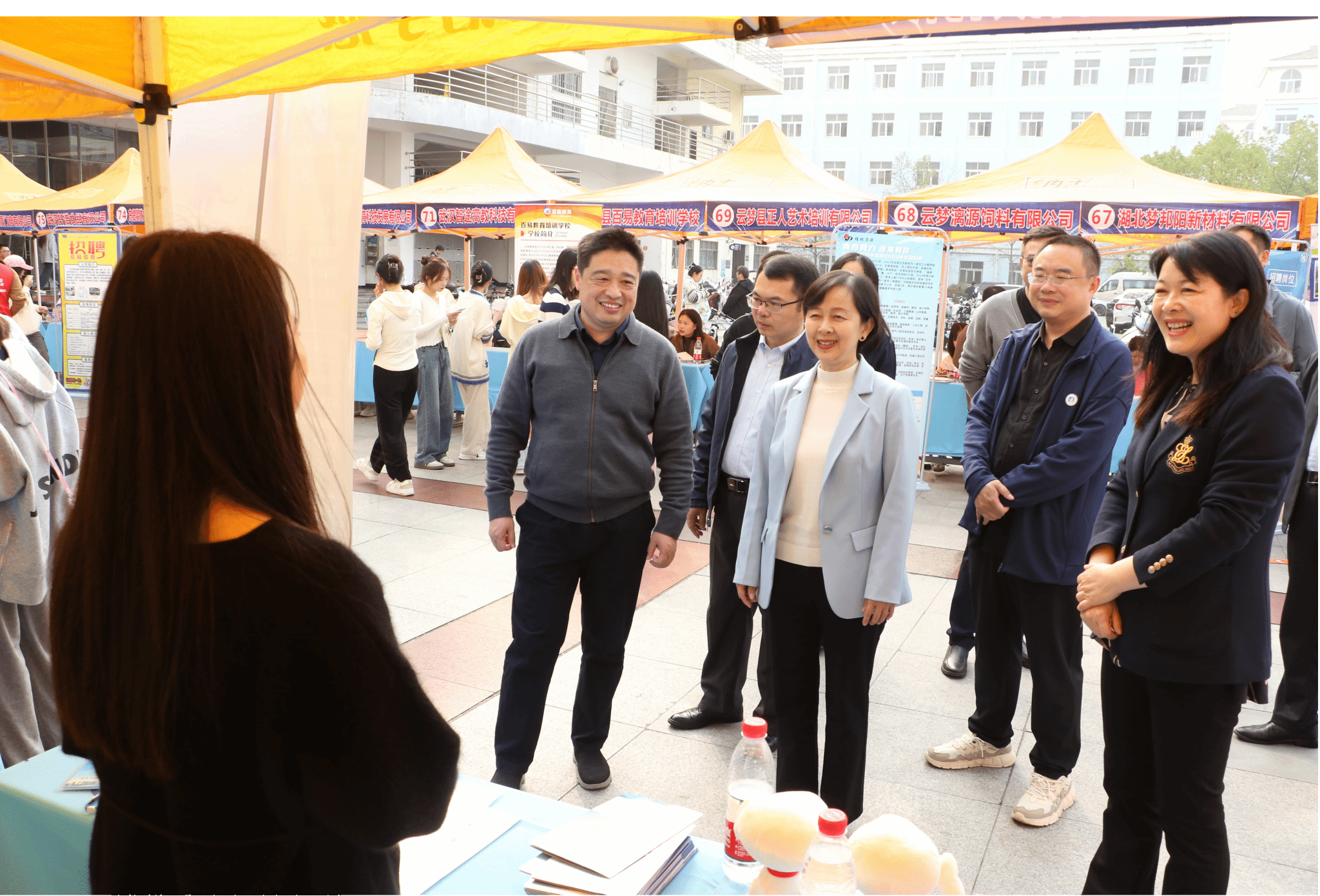 孝感市人力资源和社会保障局三级调研员杜文,孝感市人才服务局副局长周尚敏,公司经理张辉、党委书记欧阳莉莎、党委副书记蒋成、副经理郭勇亲临供需见面会现场指导工作。公司人才招聘处和各系相关负责同志到招聘会现场详细了解企业招聘需求,深入现场了解员工求职状况,指导毕业生求职应聘。