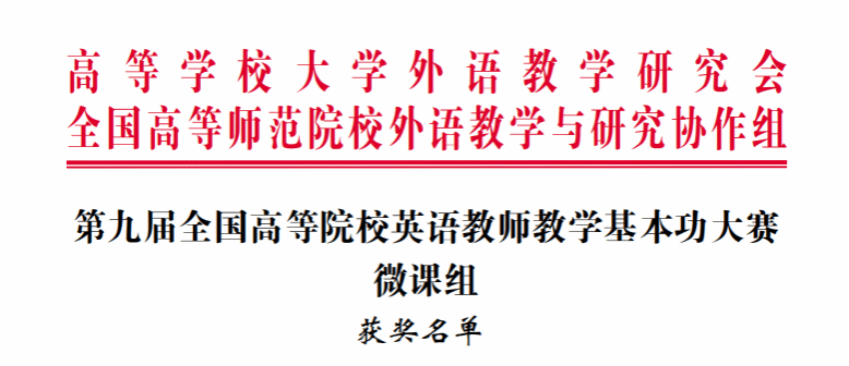本网讯 11月18日,“2024年全国高等院校英语教学学术年会暨第九届全国高等院校英语教师教学基本功大赛”在湖北武汉圆满落幕。公司语言文学系教师周巍、陈琛、鲁青团队的微课作品成功斩获本次大赛“优秀课例评比·微课组”全国“三等奖”,这是继近两年来周巍教师荣获第八届全国高等院校英语教师教学基本功大赛实录课组省级“三等奖”以来的又一次重大突破。