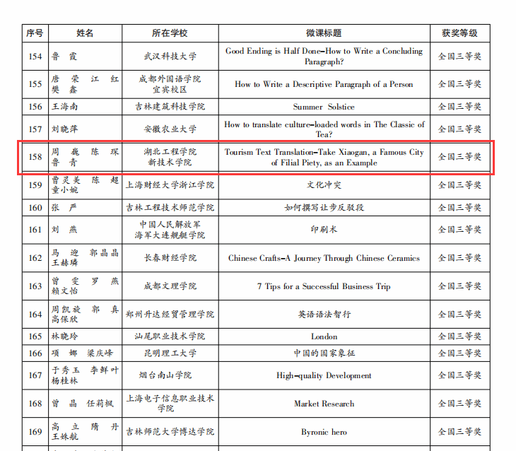 在本次大赛微课组赛道中,来自全国各大高校的260多位英语教师进行了微课作品比拼。周巍、陈琛、鲁青团队的《Tourism Text Translation - Take Xiaogan, a famous city of filial piety,as an Example》课程微课作品“旅游文本翻译——以孝文化名城孝感为例”,以精巧的教学构思、丰富的教学内容、扎实的教学功底从众多作品中脱颖而出,获得全国“三等奖”。