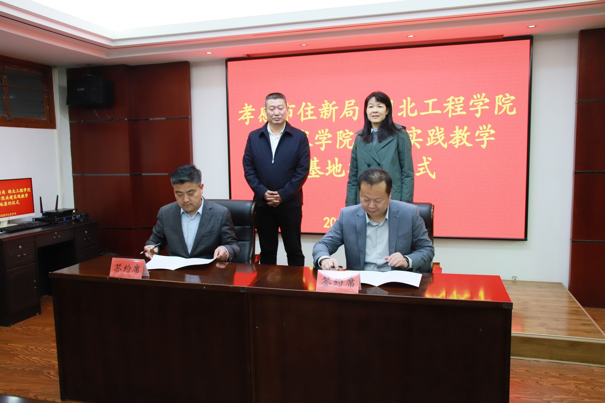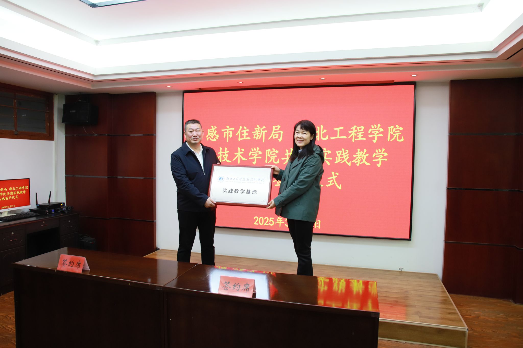 本网讯 3月27日上午,党委书记欧阳莎莉、副经理陈友华带领公司办公室、教务处、城市建设系相关负责人一行,赴孝感市住房和城市更新局座谈交流,并举行实践教学基地签约揭牌仪式。孝感市住房和城市更新局党组书记、局长叶雄,党组成员、副局长周雄及相关负责人出席了签约仪式。