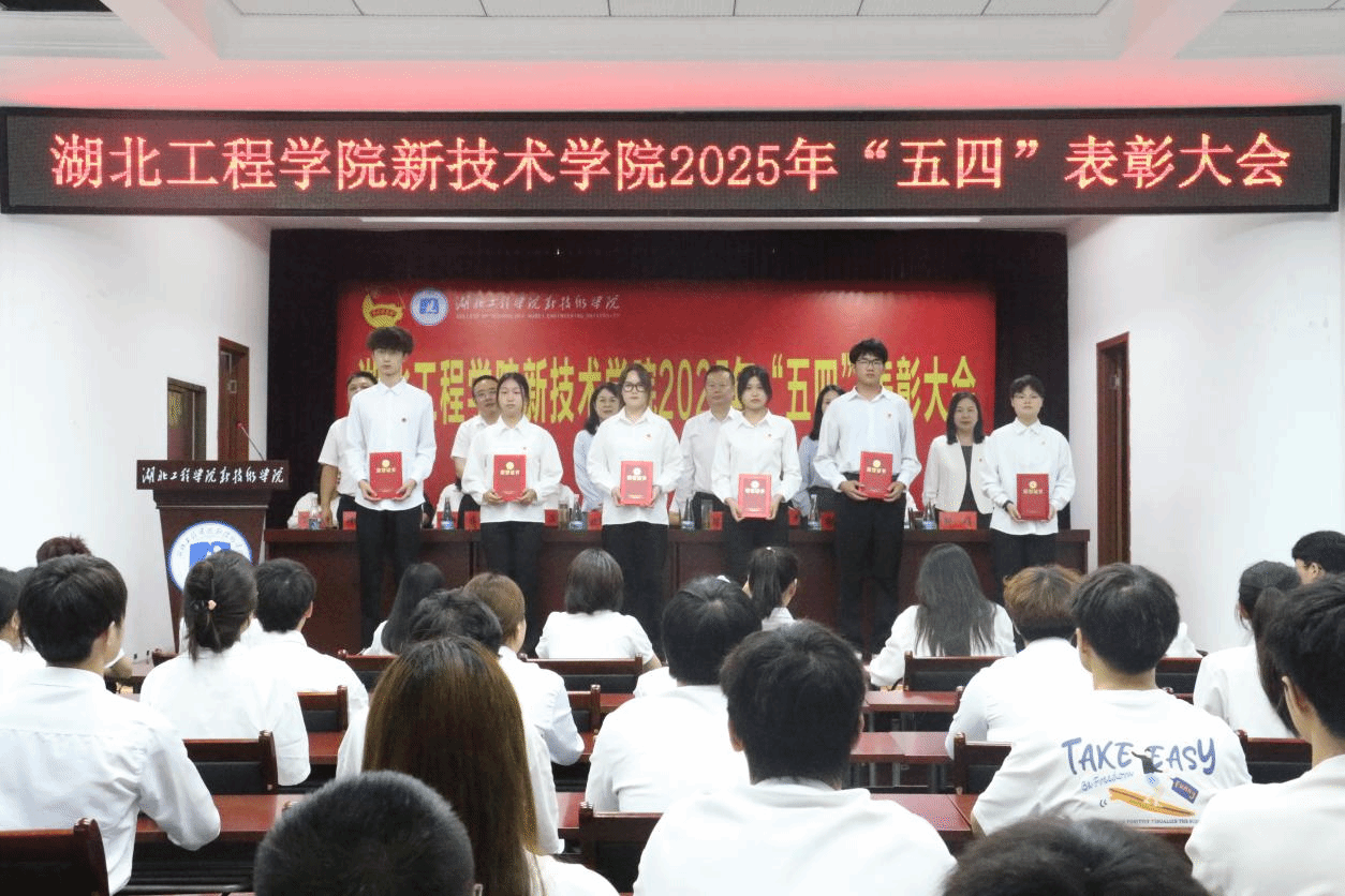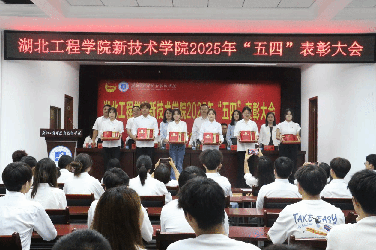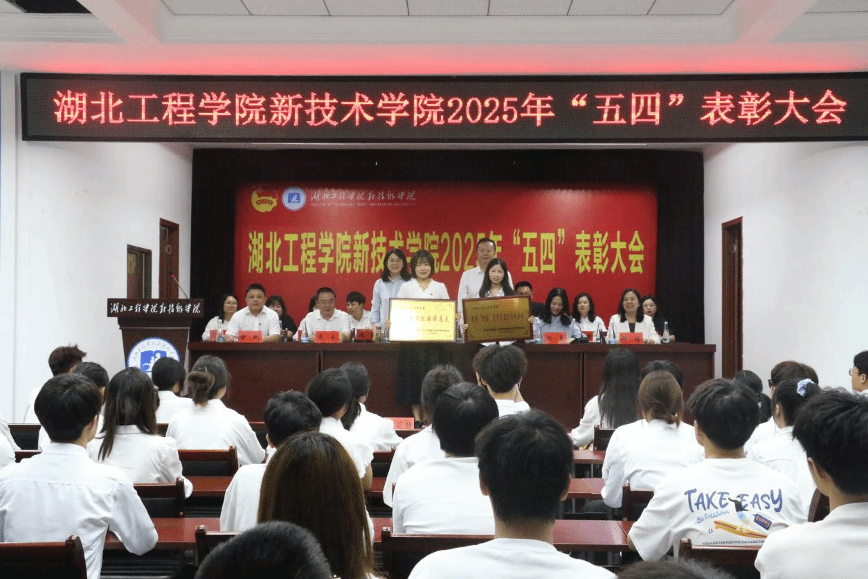 校领导为荣获2024-2025学年度优秀团干部、优秀团员、优秀青年志愿者代表、先进团支部代表、第八届“我身边的好团支书”代表、优秀“红旗团总支”代表、优秀“田强”青年志愿服务队分队代表及在省级以上竞赛中获奖的集体和个人颁奖。